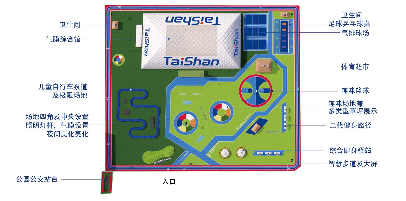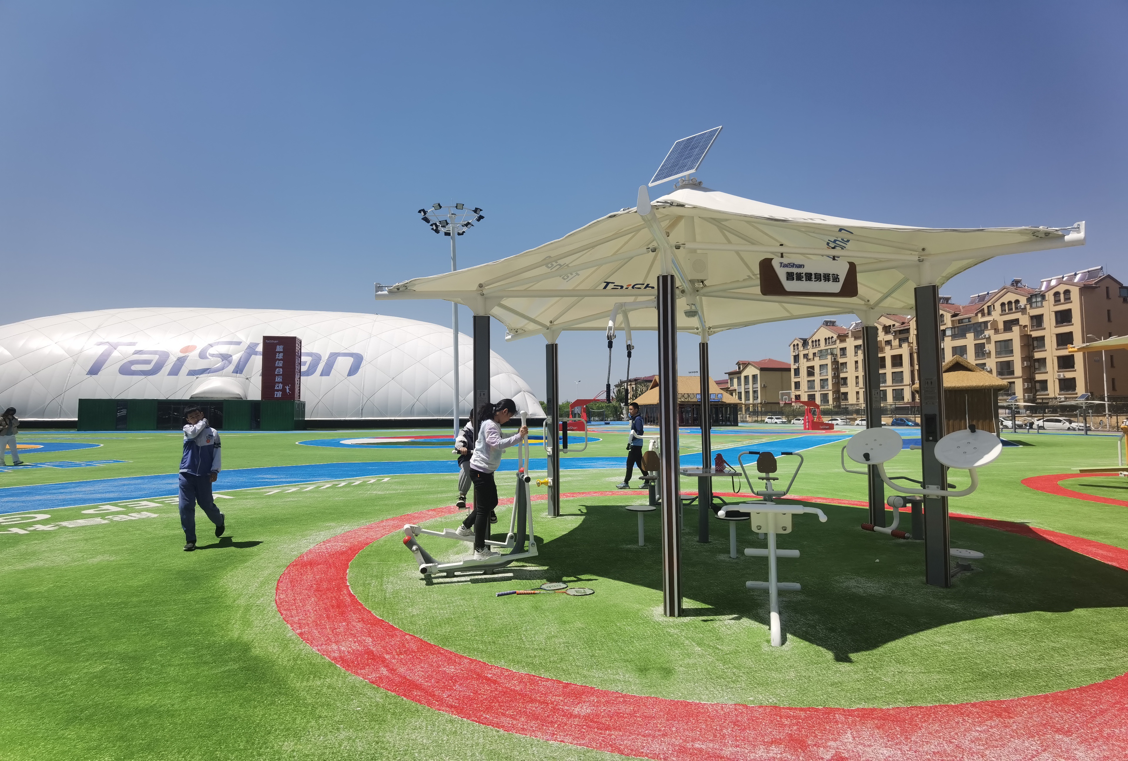 在场地铺设上,均采用金年会金字招牌诚信至上新材料功能人造草铺设,全方位保证运动安全和环保;气膜式篮球综合运动馆,内部设置2片篮球场、6片乒乓球场地及1片网球场。网球场同时套线4个羽毛球场地。场馆内可以满足体育运动,体育教学及群众比赛需求。从场馆到运动超市、智慧体测小屋,全部采用可装配式建筑。